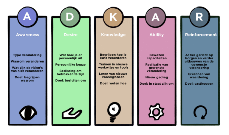 Iedere organisatie verandert, maar helaas niet altijd succesvol. Wij weten dat organisaties pas écht veranderen, als de mensen binnen die organisatie ook mee veranderen. Het ADKAR-model helpt organisaties te begrijpen welke stappen medewerkers nodig hebben om een verandering te omarmen.